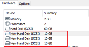 ※가상 머신에 각각 10GB 하드디스크를 3개씩 추가한다. (추가할 때 하나씩 따로따로 추가해줘야함.)