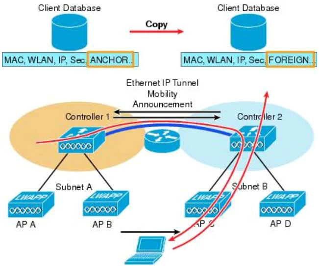 A. An EoIP tunnel is created between the client and the anchor controller to provide seamless connectivity as the client is associated with the new AP B. The client entry on the original controller is passed to the database on the new controller C. The new controller assigns an IP address from the new subnet to the client D. The client database on the original controller is updated the anchor entry, and the new controller database is updated with the foreign entry.