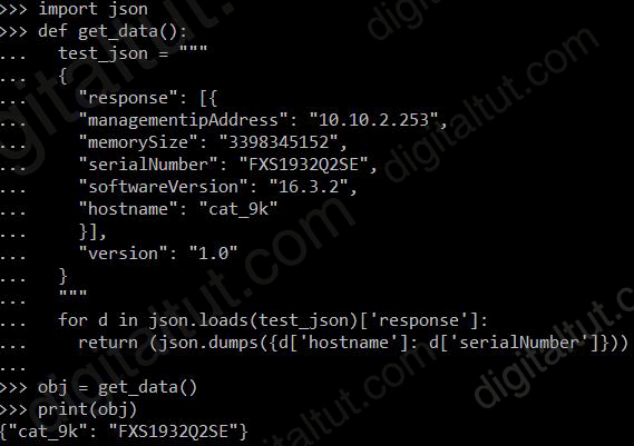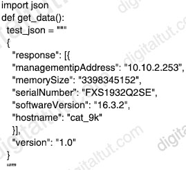 A. return (json.dumps({d[‘hostname’]: d[‘serialNumber’] for d in json.loads(test_json)[‘response’]})) B. return (json.loads({for d in json.dumps(test_json)[‘response’]: d[‘hostname’]: d[‘serialNumber’]})) C. return (json.loads({d[‘hostname’]: d[‘serialNumber’] for d in json.dumps(test_json)[‘response’]})) D. return (json.dumps({for d in json.loads(test_json)[‘response’]: d[‘hostname’]: d[‘serialNumber’]}))