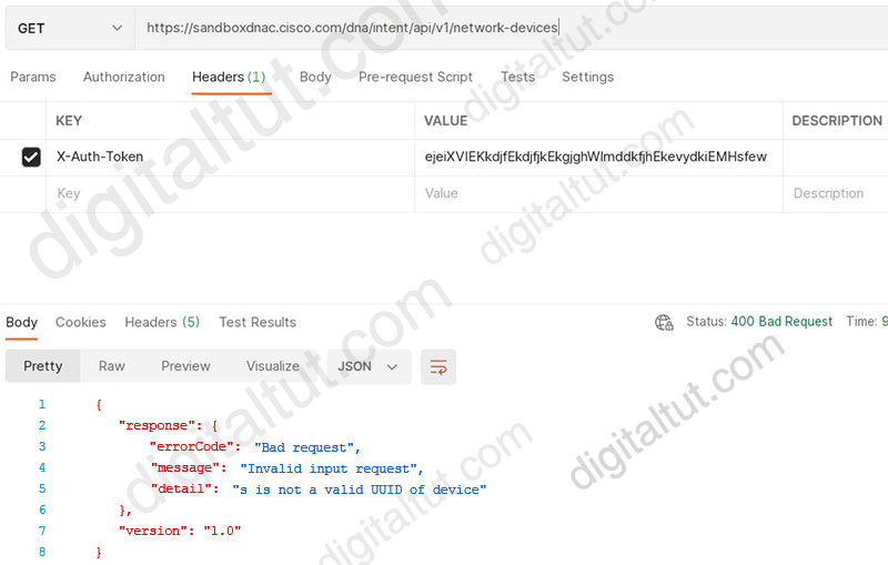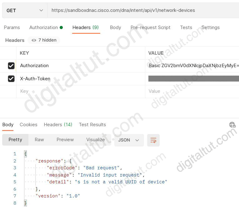 POSTMAN is showing an attempt to retrieve network device information from Cisco DNA Center API. What is the issue?