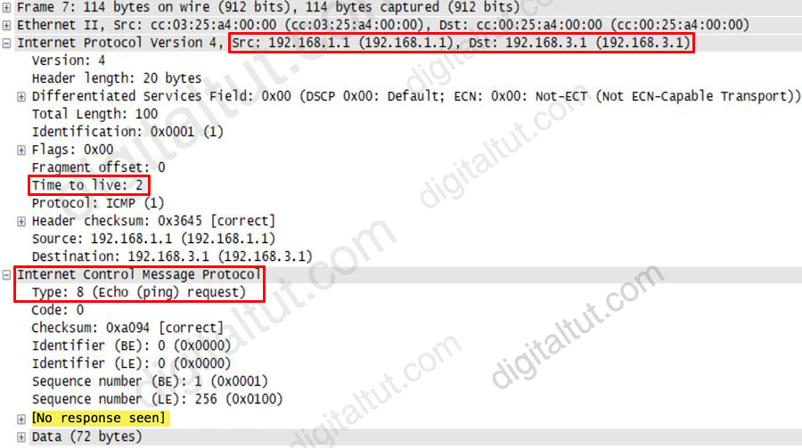 The picture below shows TTL values for each interface of each router and for Host B. Notice that Host A initializes ICMP packet with a TTL of 255: