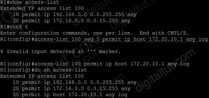 We tested option D but the command “access-list 100 seq 5 permit ip host 172.20.10.1 any log” is not accepted as shown below: