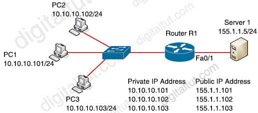 | Option A RouterR1(config)#int f0/0 RouterR1(config)#ip nat inside RouterR1(config-if)#exit RouterR1(config)#int f0/1 RouterR1(config)#ip nat outside RouterR1(config-if)#exit RouterR1(config-if)#access-list 1 10.10.10.0 0.0.0.255 RouterR1(config)#ip nat pool POOL 155.1.1.101 155.1.1.103 netmask 255.255.255.0 RouterR1(config)#ip nat inside source list 1 pool POOL |