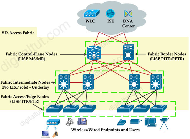 There are five basic device roles in the fabric overlay: + Control plane node: This node contains the settings, protocols, and mapping tables to provide the endpoint-to-location (EID-to-RLOC) mapping system for the fabric overlay. + Fabric border node: This fabric device (for example, core layer device) connects external Layer 3 networks to the SDA fabric. + Fabric edge node: This fabric device (for example, access or distribution layer device) connects wired endpoints to the SDA fabric. + Fabric WLAN controller (WLC): This fabric device connects APs and wireless endpoints to the SDA fabric. + Intermediate nodes: These are intermediate routers or extended switches that do not provide any sort of SD-Access fabric role other than underlay services.