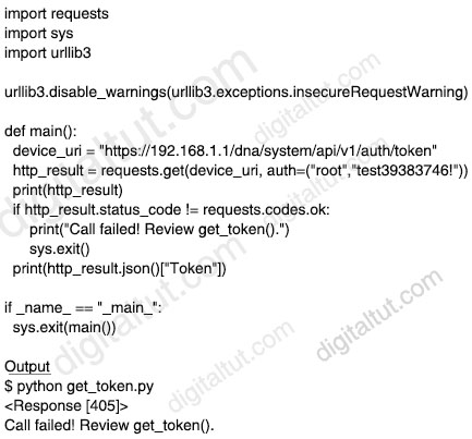 “The Authentication endpoint used in this guide is /dna/system/api/v1/auth/token, which is valid for version 1.2.6 and above. The HTTP method used for the endpoint is POST and it requires for the user to send its credentials using Basic Authentication. Note: For systems with versions below that, the endpoint is /api/system/v1/auth/token”
