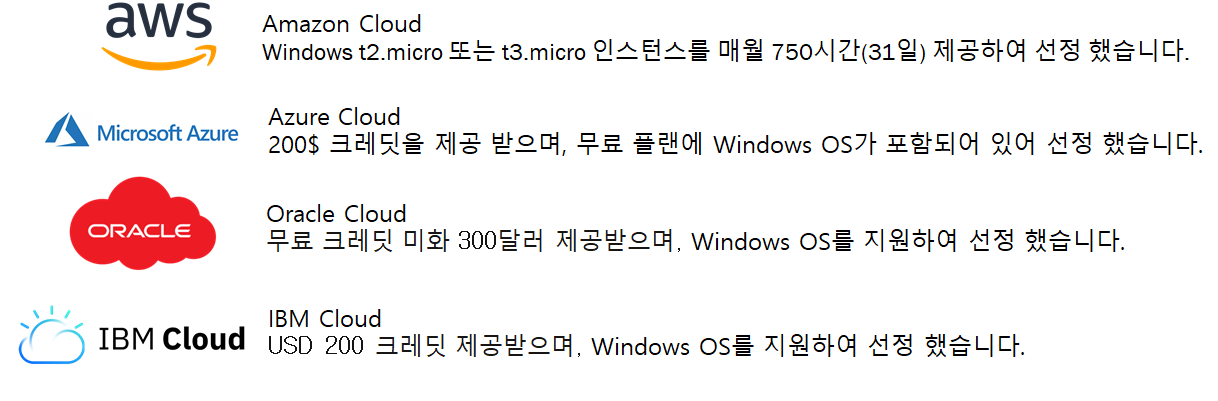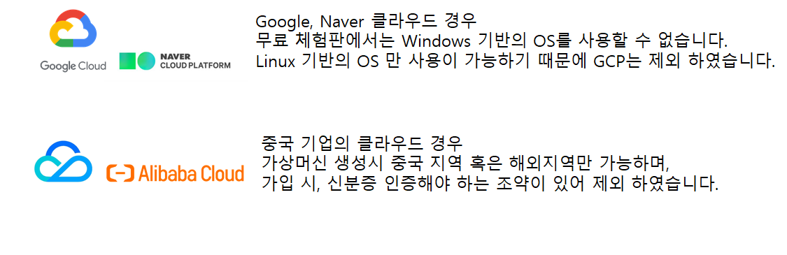 GCP, NCP는 무료 체험에 Windows 기반의 OS가 없다는 점입니다.
