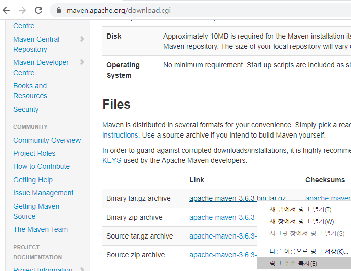 Maven 사이트에 접속하여 설치 링크 주소를 복사합니다.